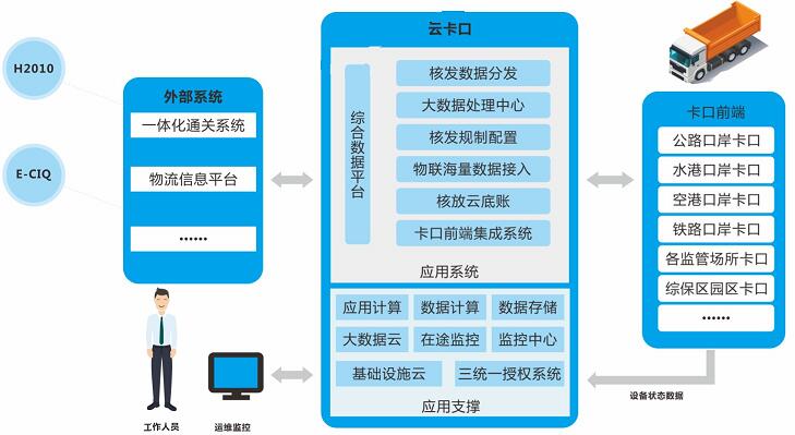 系統(tǒng)主要由前端嵌入式物聯(lián)設(shè)備、自適應(yīng)負(fù)載均衡總線、集中管控云平臺(tái)、綜合數(shù)據(jù)云底賬監(jiān)控平臺(tái)等組成,實(shí)現(xiàn)前端物聯(lián)設(shè)備分散式接入、集中管理,智能卡口云平臺(tái)集中部署,云底賬大數(shù)據(jù)智能分析,全面兼容各類卡口硬件和業(yè)務(wù)流程,實(shí)現(xiàn)物流底賬與車輛通行集中驗(yàn)放管理。通過云平臺(tái)集中部署,實(shí)現(xiàn)前端物聯(lián)設(shè)備自適應(yīng)接入與智能化運(yùn)行狀態(tài)分析,實(shí)現(xiàn)系統(tǒng)軟件插件式集中管理,以及不同卡口功能模塊的集中配置與推送。